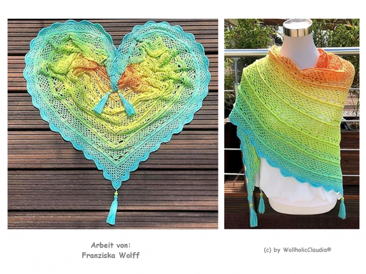 Dieses wunderschöne, sommerliche Tuch entspannt schon beim Häkeln. Es hat ein wiederkehrendes und absolut fernsehtaugliches Muster und das Beste: Die Größe kann individuell bestimmt werden. Es geht sehr schnell in die Breite und schon mit 1000m Garn erreicht man eine beachtliche Spannweite.