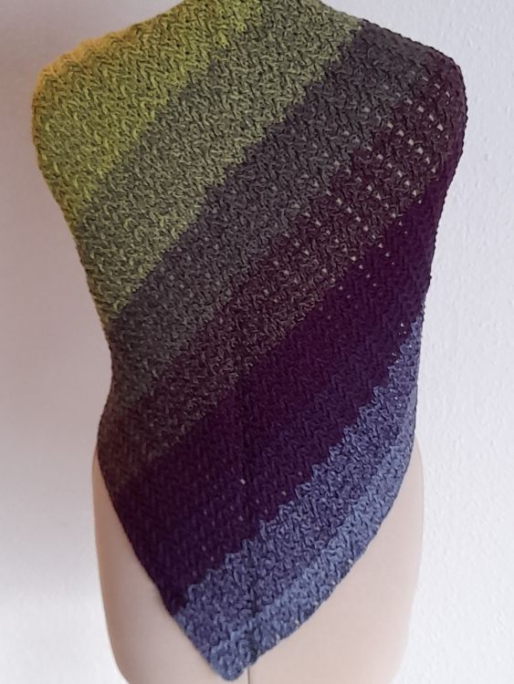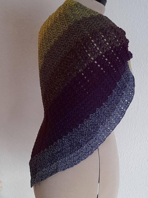 Lena kannst Du als klassisches Schultertuch tragen oder als Schal. Durch das Muster ist auch die asymmetrische Form ein klassisches Dreieckstuch mit 2 gleich langen Seiten, nur läuft das Muster quer.