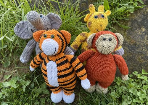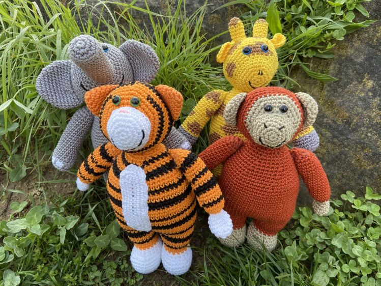 Für das Nacharbeiten wird folgendes Material benötigt: Baumwollgarn in verschiedenen Farben, je Tier 1 Paar Sicherheitsaugen, 9 mm, Chenilledraht (Pfeifenputzer) für Elio Elefant, Füllwatte, Häkelnadel Nr. 2,5, Nadel für das Vernähen der Fäden und Zusammennähen der Einzelteile, Schere, Maschenmarkierer