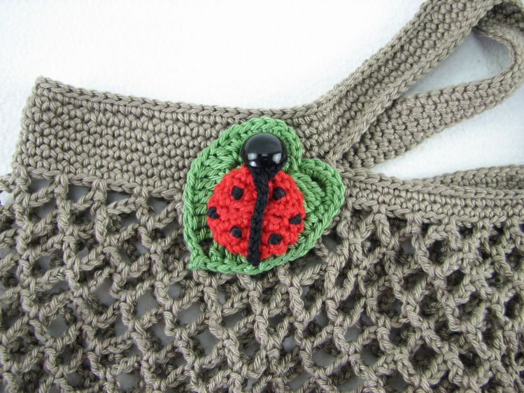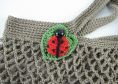 Der kleine Marienkäfer auf dem Blatt wird an der Tasche angenäht und verbirgt in seinen Innern einen Chip oder ein Geldstück.