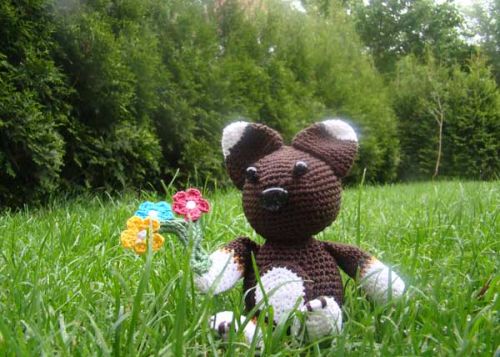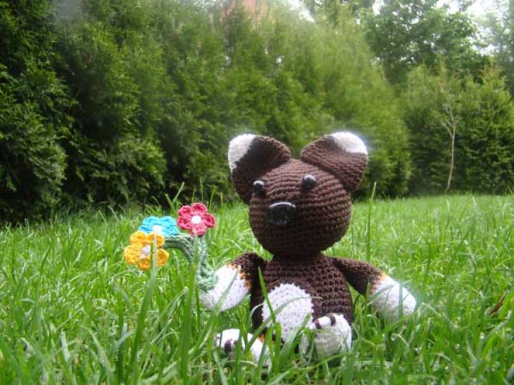 Freddy Fuchs kommt mit einem Blumenstrauss daher und guckt seinen neuen Besitzer oder seine neue Besitzerin mit seinen schwarzen Kulleraugen groß an. Freddy ist aus wenigen Formen schnell gehäkelt, so dass er ein schönes Geschenk für liebe Freunde, Familienmitglieder oder die Kinder ist.