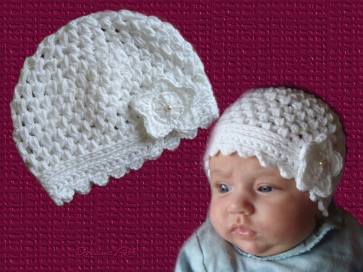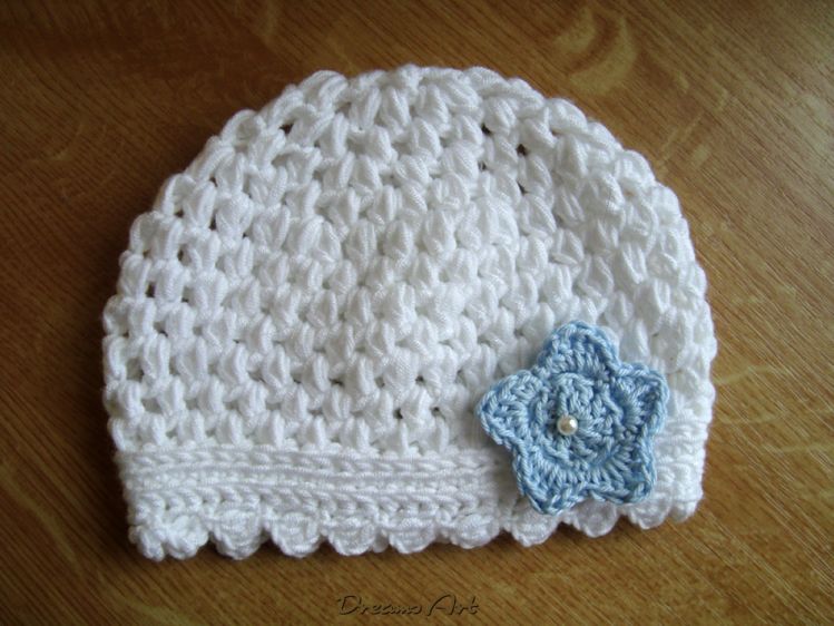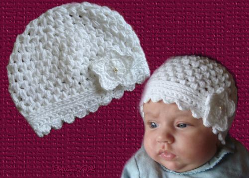 Hier bekommst du in elektronischer Form eine Anleitung für eine gehäkelte Babymütze mit Noppen (Büschelmaschen). Diese Häkelmütze ist ideal für die Übergangszeit oder auch für den Sommer. Viele nehmen sie auch als Taufmütze, zur Hochzeit oder sonstigen Gelegenheiten. Die Babymütze passt für einen Kopfumfang von 36 bis 40 cm.