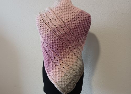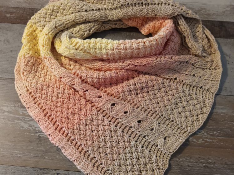 Für das Tuch vom Titelbild habe ich 2000m Lauflänge eines 3fädiger Bobbel verarbeitet, bzw. ich habe hier 2 identische verhäkelt und den 2. gegengleich angesetzt, deshalb sind die Farbabschnitte nach unten gespiegelt.