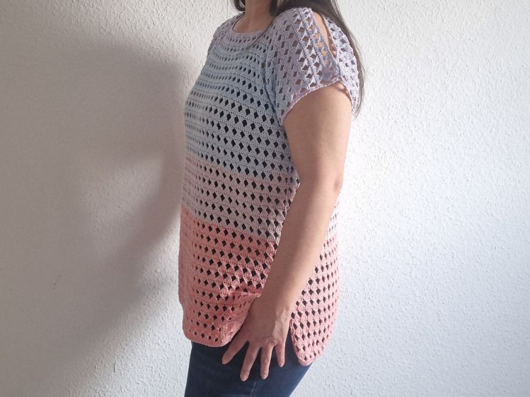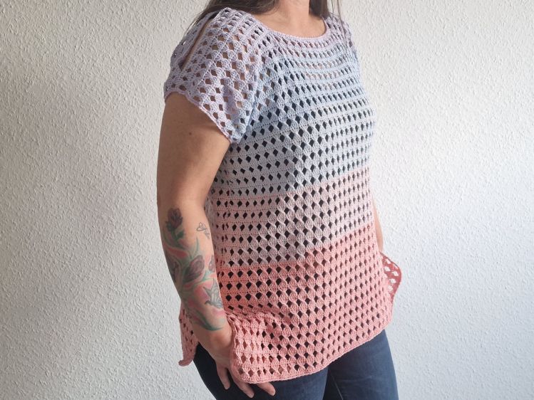 Nach dieser Anleitung kannst Du dir ein luftiges Cold – Shoulder – Shirt häkeln, das auch am Strand oder im Schwimmbad super über Bikini oder Badeanzug angezogen werden kann. Neben den offenen Schultern sind die seitlichen Schlitze ein weiterer Eyecatcher.