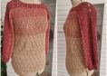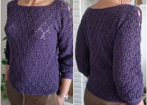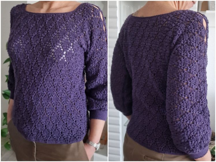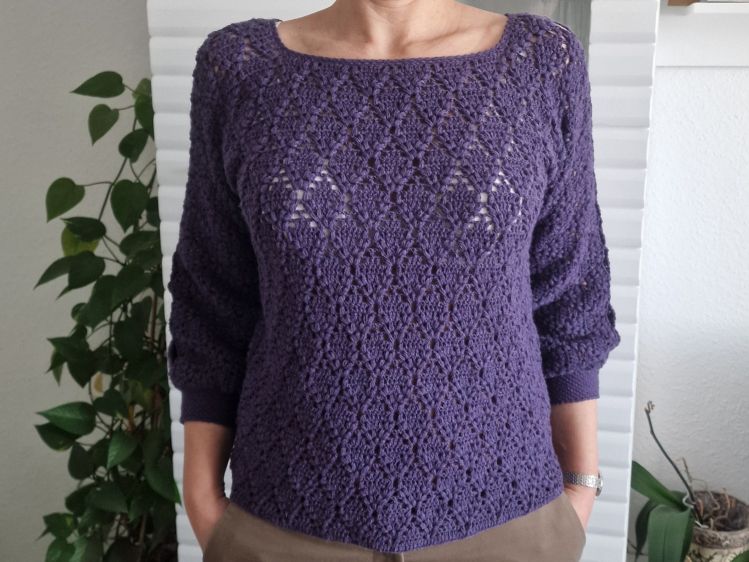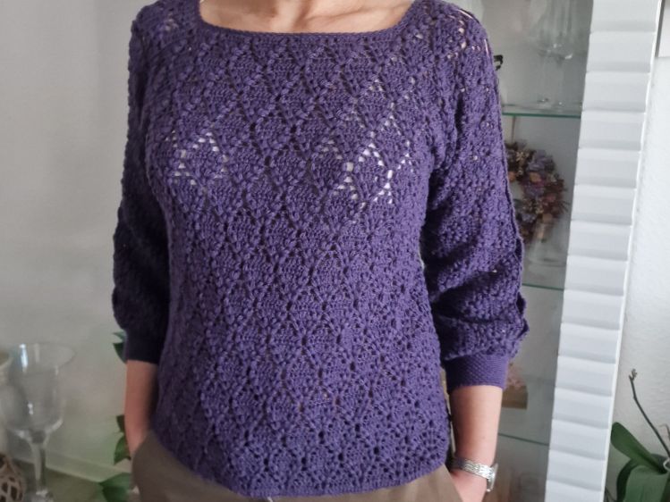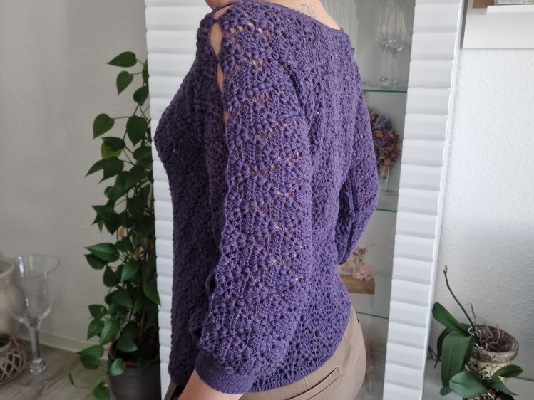 Er ist von der Machart wie der Pulli "Aurelia" aber mit 7/8 Armen und einer Shirtform, also etwas körperbetonter. Außerdem besteht das Muster hier aus Luftmaschen, Stäbchen und Büschelmaschen.