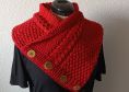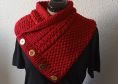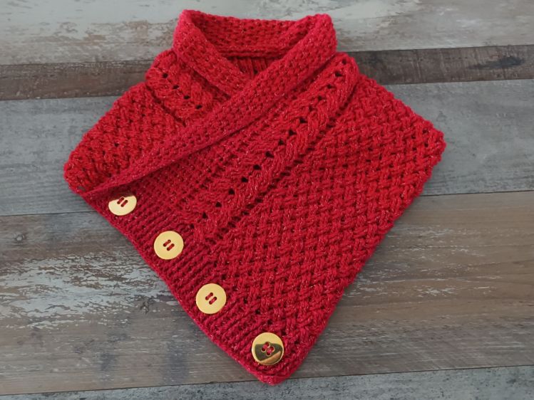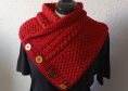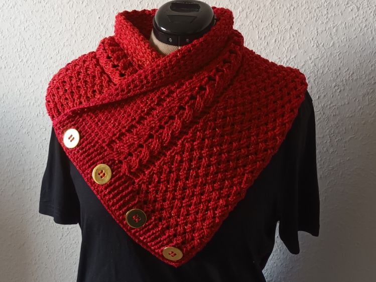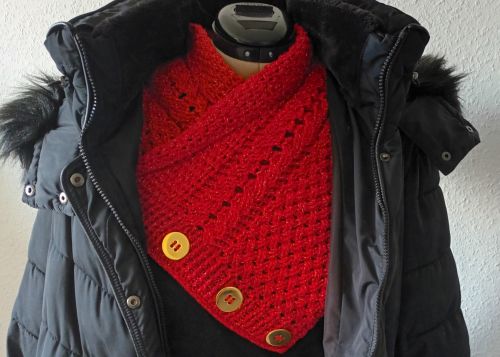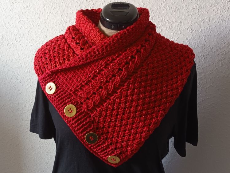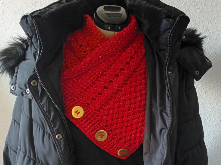 Bei diesem Schalkragen sind die Knöpfe nur Dekoration, er lässt sich nicht öffnen, da er an den unteren Kanten zusammen gehäkelt wird. Er lässt sich aber bequem an- und ausziehen und die Öffnung ist groß genug, um ihn einfach über den Kopf zu ziehen.