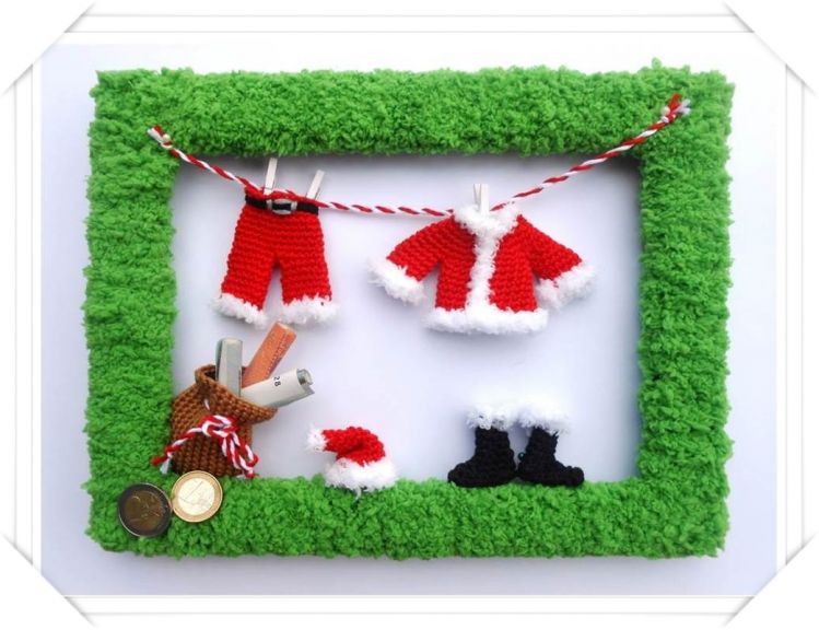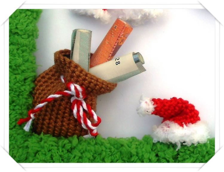 Deine Weihnachtsgrüße kommen doppelt gut an, denn mit diesem gehäkelten Bild hast Du nicht nur ein originelles Geldgeschenk, sondern nach der Sack Leerung auch noch eine witzige Deko, an Tür oder Wand ist es ein lustiger Hingucker.