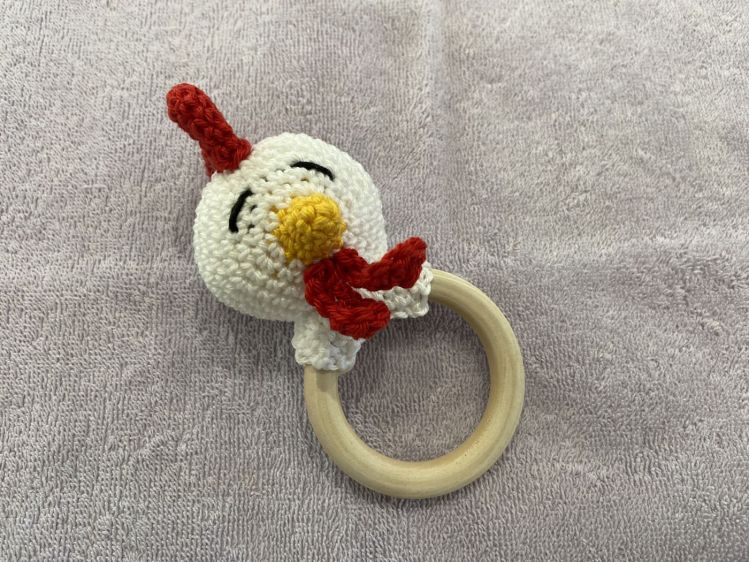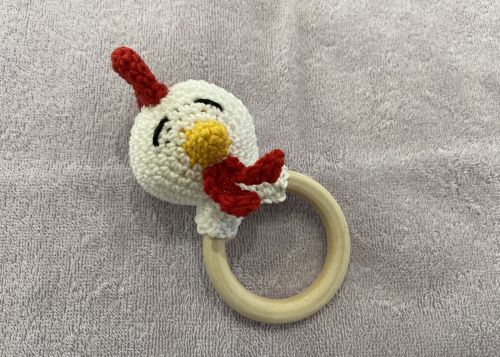 Mit dem Greifring "Huhn" kann das Baby seine Greifreflexe üben. Und nicht nur zur Osterzeit ist er ein kleines, willkommenes Geschenk