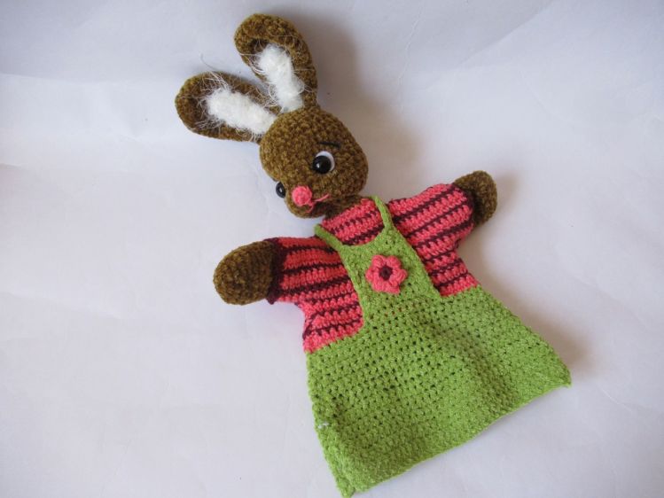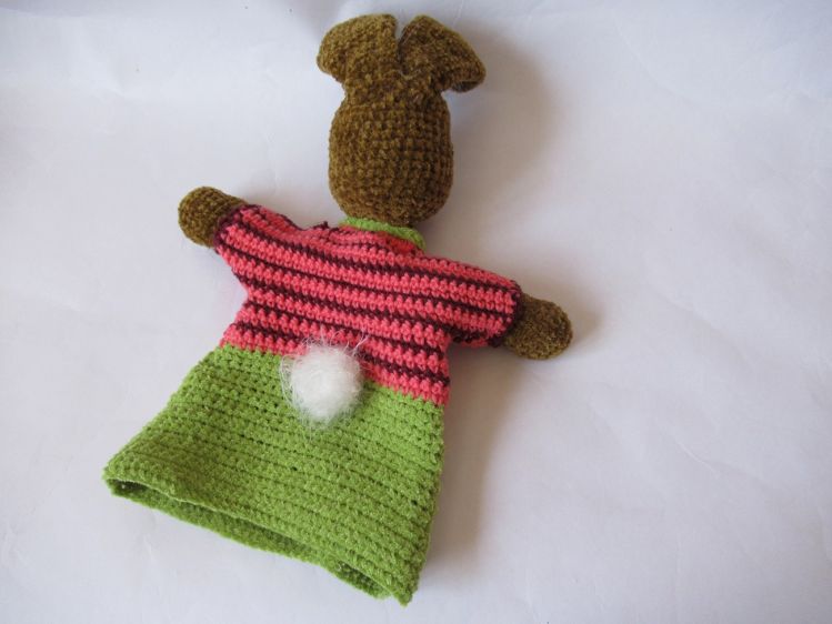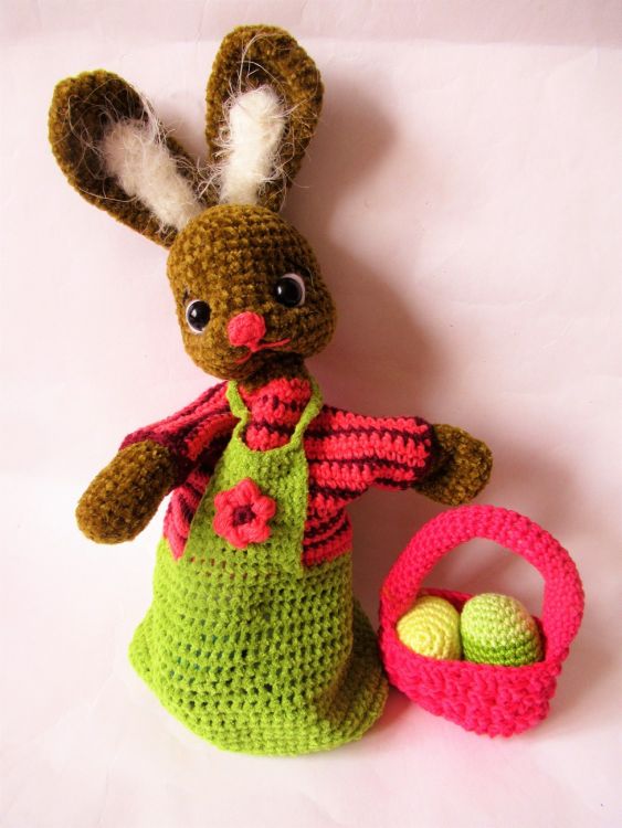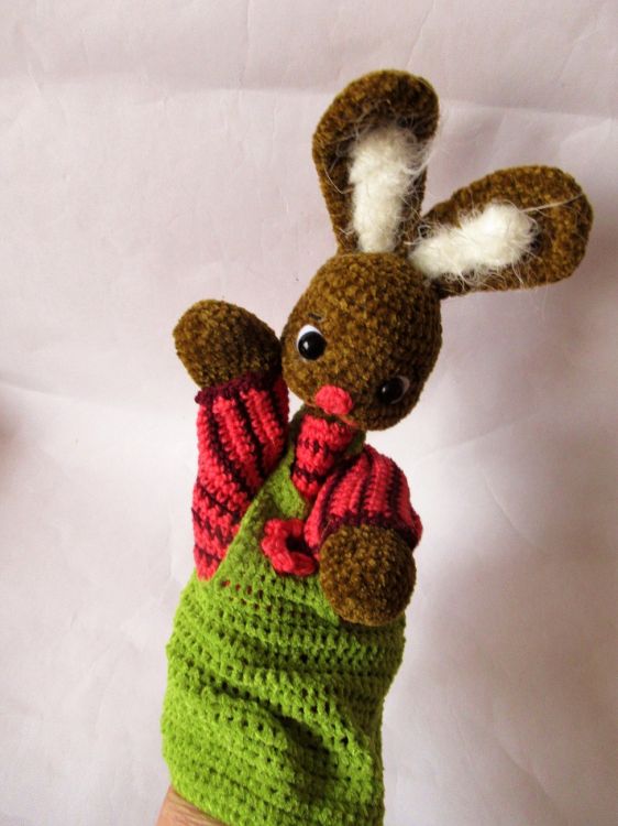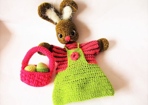 Die Osterhasen-Handpuppe habe ich aus dünnem Chenillegarn gehäkelt, damit man mit ihr nicht nur Theater spielen sondern auch kuscheln kann. Als Bonus gibt es die Anleitung für das Körbchen und die Ostereier mit dazu.