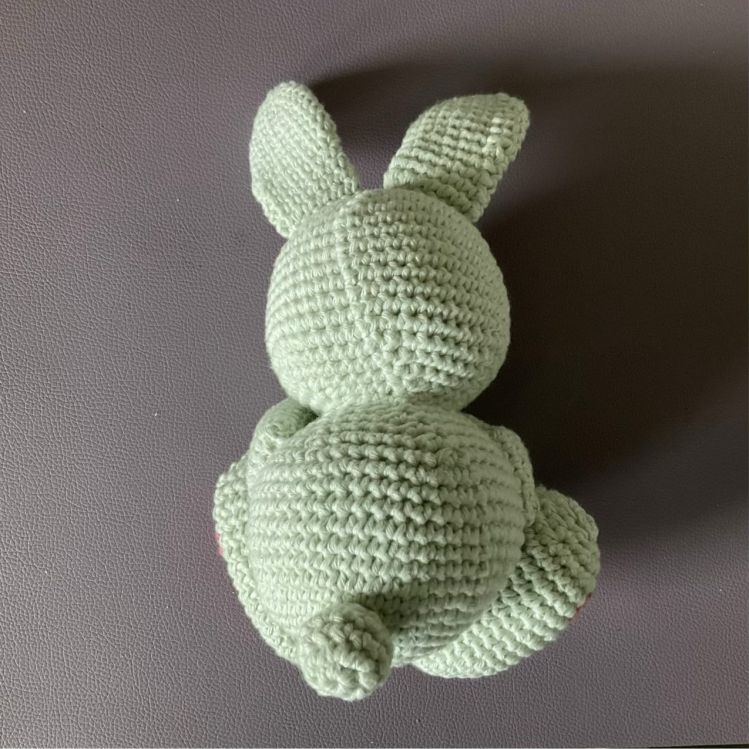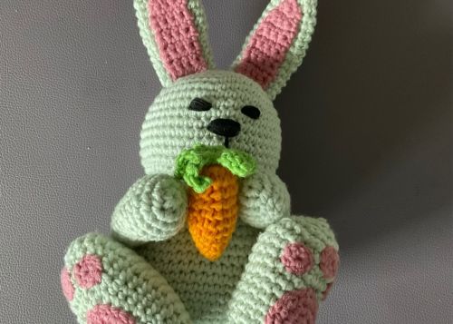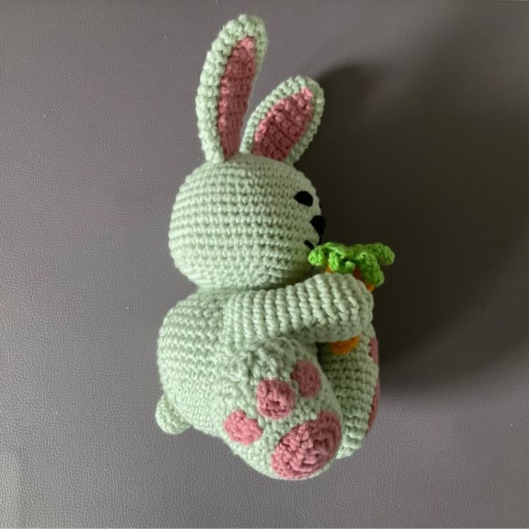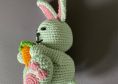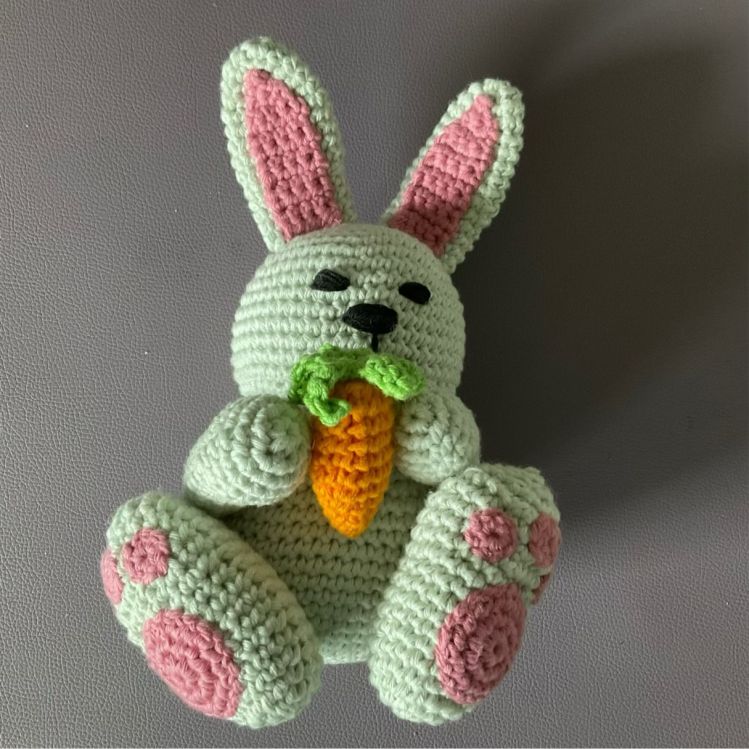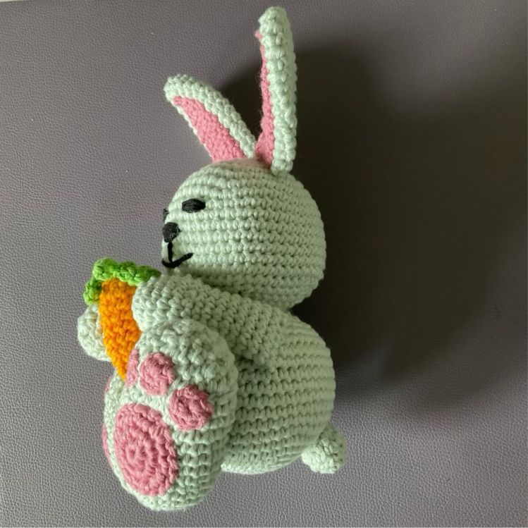 Am Ende entsteht mit der von mir verwendeten Wolle ein 20cm großer Hase mit Möhre.