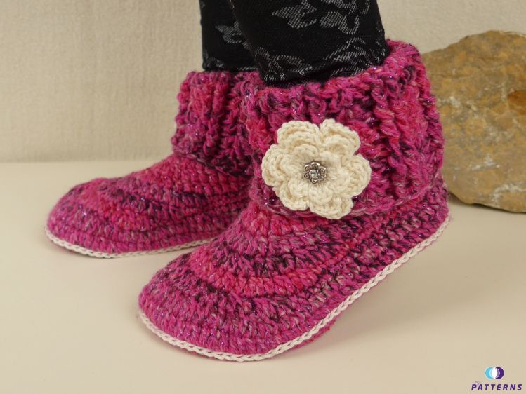 Wer kennt das nicht? Kalte Füße im Winter! Mit diesen Hausschuhen ist nun Schluss damit. Sie sind stylisch und bequem wie gestrickte Socken. Richtig flott wirken sie durch die Schuhoptik. Für eine bessere Passform wird die Sohle an der Ferse schmäler gehäkelt. Bei den abgebildeten Schuhen habe ich eine klassische Lieblingsfarbe für Mädchen, mit integriertem Glitzerfaden benützt. In einer anderen Farbe können diese Schuhe auch Jungs tragen.
