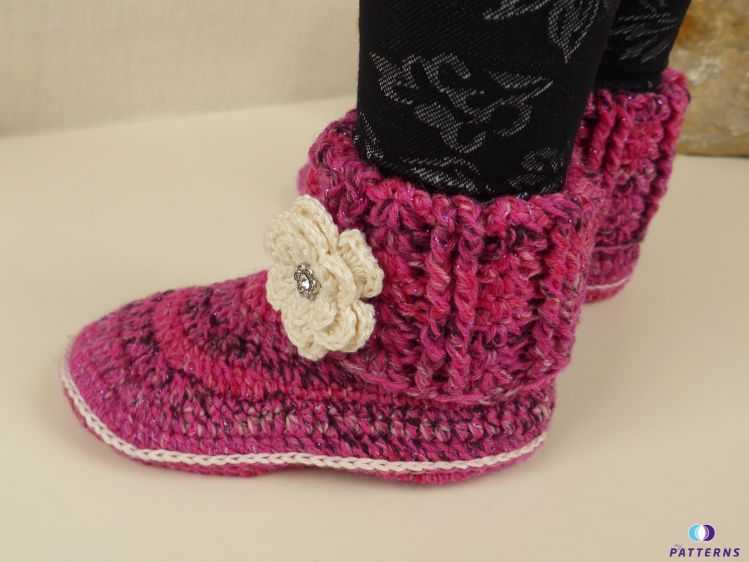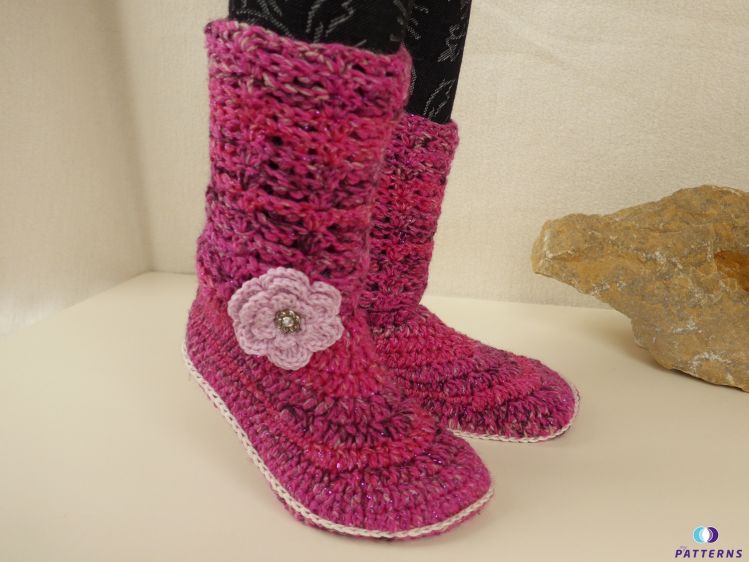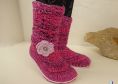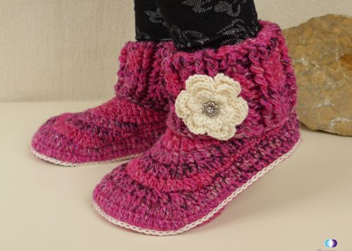 Das Besondere an den Hausschuhen ist, das sie 2 Tragemöglichkeiten bieten. Sie können als Hausbooties oder als Stiefel getragen werden. Das Muster des Schaftes sieht von beiden Seiten schön aus. Die Blumen sind abnehmbar und können beliebig ausgetauscht werden. Sie können je nachdem, wie der Schuh getragen werden soll, wieder an der gewünschten Stelle angebracht werden. Wenn du die Blumen in verschiedenen Farben häkelst, kannst du so die passende Blume zur Kleidung wählen. Es ist also nicht notwendig, zwei Paar dieser Schuhe zu häkeln. Bereits ein paar verfügt über diese 2 Tragevarianten.