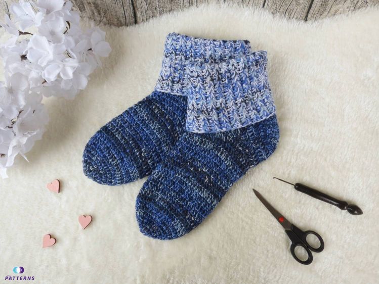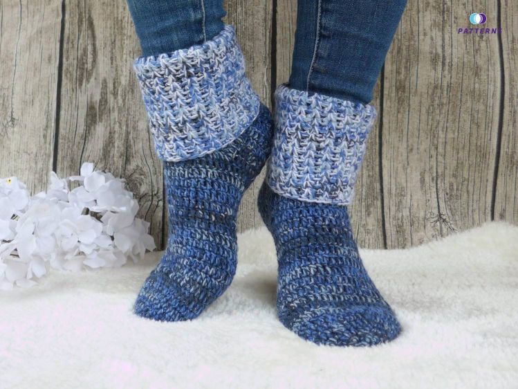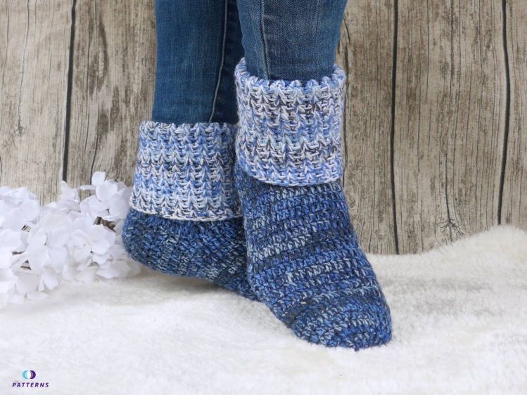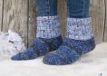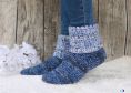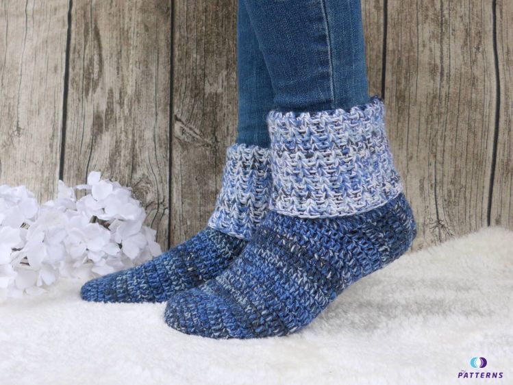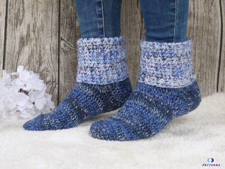 Socken müssen nicht unbedingt langweilig wirken. Nein, sie können auch ein richtiger Blickfang sein. Die Haussocken "Ice Flower" sind schön warm und trotzdem absolut bequem. Sie können mit einem farblichen Sockengarn oder auch mit einem Einfarbigen gehäkelt werden. Ich habe 4-fach Sockenwolle, doppelt verhäkelt. Auch eine 6-fach Sockenwolle ist möglich. Wenn du die Socken nicht ganz so dick möchtest, benützt du die Sockenwolle nur einfach.