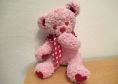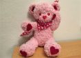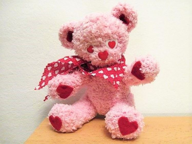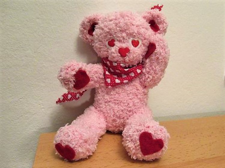 Herzibär liebt Herzen: Er hat herzförmige Augen, Ohren, Fußsohlen, Handflächen, eine herzförmige Nase und ein Halstuch mit Herzchenmuster.