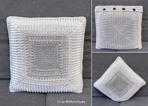 Diese wunderschönen Kissen sind passend zur Decke „Hypnotic“ entworfen worden. Hier hat man die Möglichkeit, 2 unterschiedliche Musterseiten zu gestalten oder beide Kissenhälften identisch zu arbeiten. Geschlossen werden sie mit einer Knopfleiste, die man beliebig lang machen