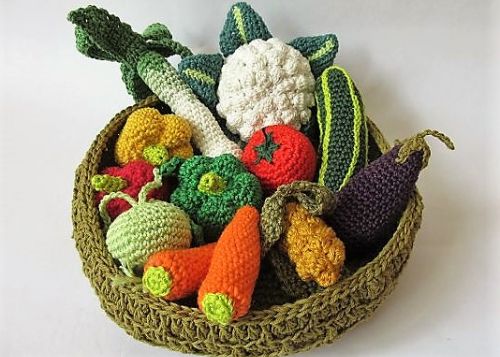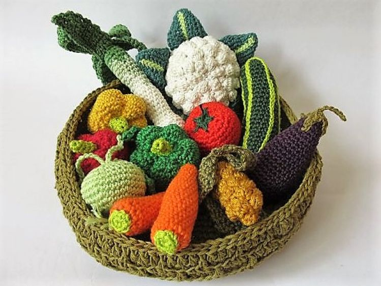 Ein Korb voller Gemüse, das immer frisch bleibt! In dem gehäkelten Korb befinden sich: