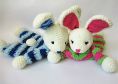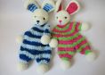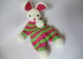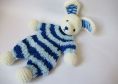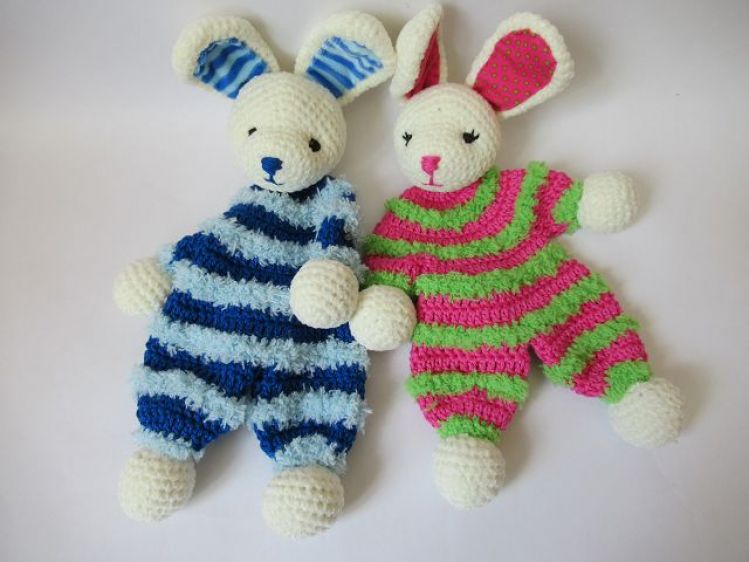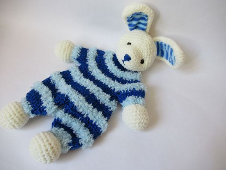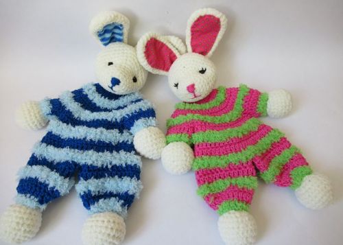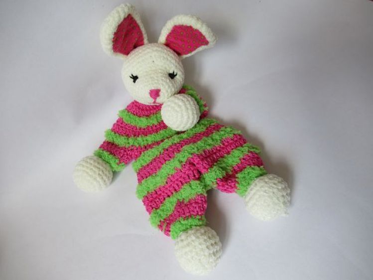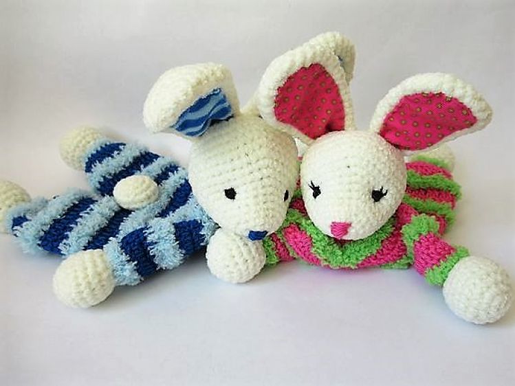 Hoppel wird etwa 30 cm groß und aus 3 verschiedenen Garnen gehäkelt. Durch die unterschiedliche Struktur der Garne wird der Tastsinn des Babys gefördert. Größere Babys werden durch die bunten Farben angesprochen.