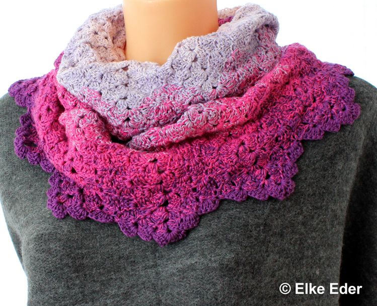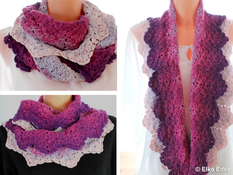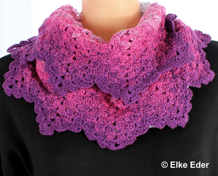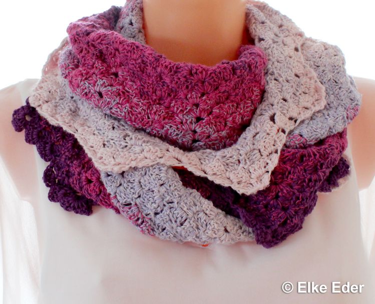 Der Loop wird in Runden, ohne Zu- und Abnahmen gehäkelt. Das Muster ist sehr genau mit Häkelschrift, Text und vielen Schrittbildern erklärt.
