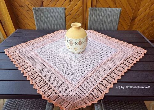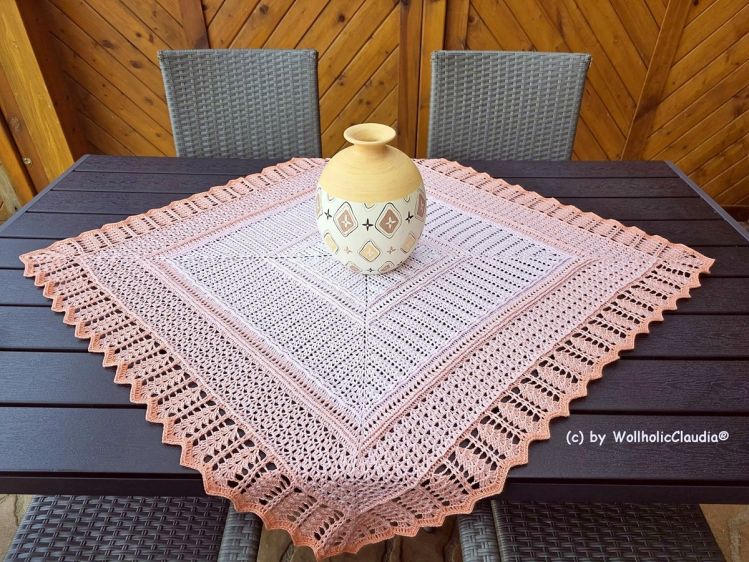 ist eine zeitlose Tischecke, die Lust auf Frühling und Sommer macht. Ob auf dem Esstisch oder wie hier auf dem Gartentisch, sie ist ein toller Hingucker. Du kannst sie mit jedem beliebigen Garn und der dazu passenden Nadelstärke anfertigen.