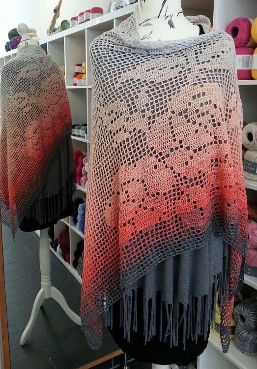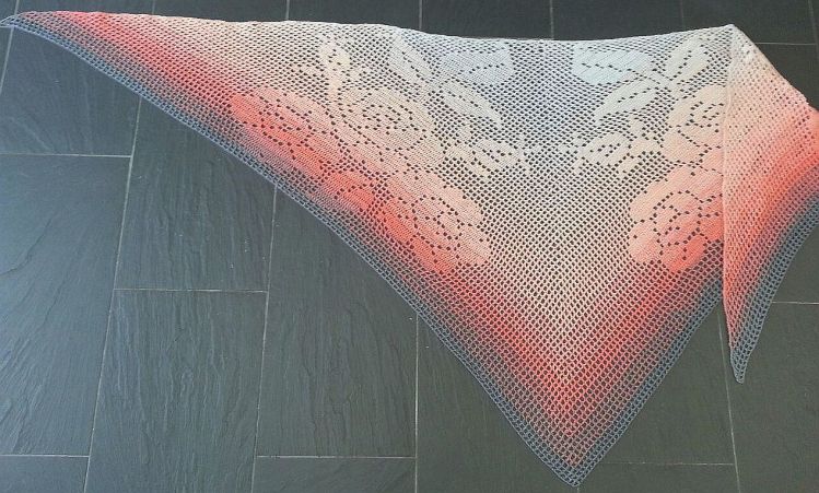 Das Tuch wird von der Mitte aus gehäkelt, das Motiv wird auf jeder Seite ein Mal gehäkelt.