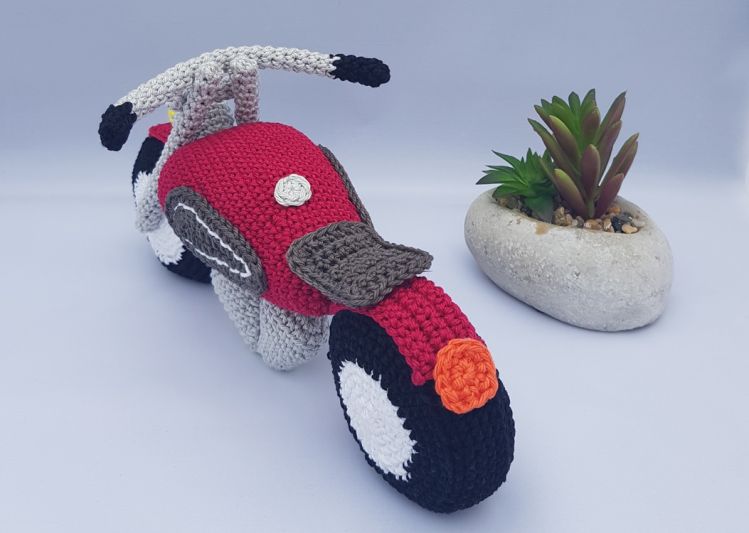 Mit dem angegebenen Garn wird dein Motorrad ca. 11 cm hoch und 23 cm lang.