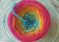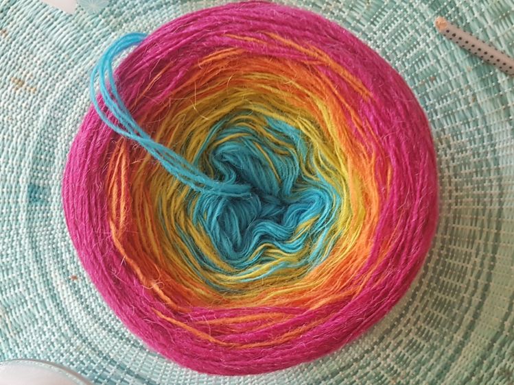 Material: Farbverlaufsgarn/Bobbel: 100g insgesamt, Lauflänge 188m, Häkelnadel 5,5 mm. Ich habe mit Farbverlaufsgarn gearbeitet, also einmal von innen und einmal von außen angefangen, damit ich zwei unterschiedliche Farben habe. Mein Garn ist von der Garnmanufaktur, Maya mit Alpaka, Farbe Nr. 949. Ihr könnt auch anderes Farbverlaufsgarn benutzen, z. B. 4 fach, Baumwolle. Ihr arbeitet dann eventuell mit einer anderen Nadelstärke und müsst mehr Runden/Zunahmen bis zum Erreichen des Durchmessers häkeln. Auch hier sollten ca. 190m reichen.