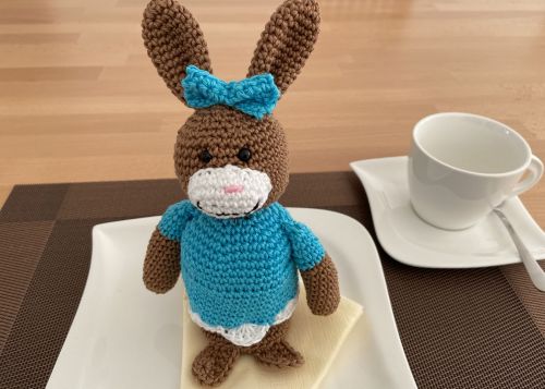 Unter Verwendung des angegebenen Materials wird das Hasenmädchen ca. 14 cm hoch.