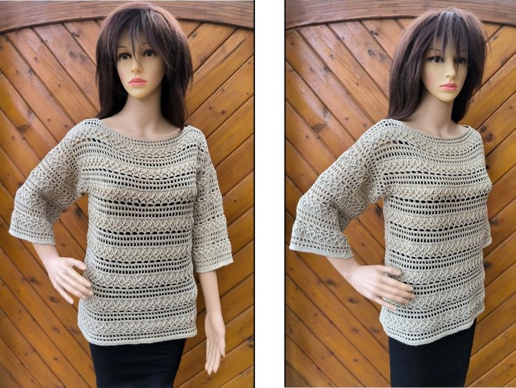 Pullover "Summerspring" ist perfekt für Frühling und Sommer. Ob mit langen Ärmeln oder wie hier im Beispiel mit 3/4 Arm, kann er individuell in jeder beliebigen Größe, Garn- und Nadelstärke angefertigt werden.