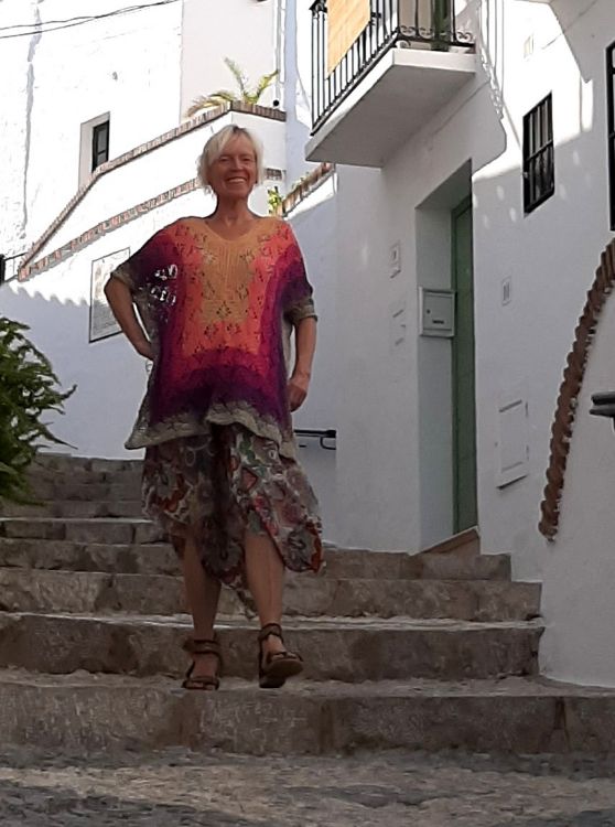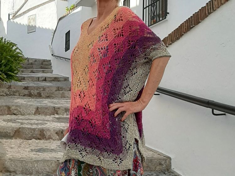 Meinen Ponchollover "Power Flower" habe ich sehr weit gehäkelt (Brustumfang ca.164cm, Länge ca. 78cm)). Er kann auch enger gemacht werden, aber auch weiter. Durch die einfache Form geht das sehr unkompliziert, wird aber auch in der Anleitung beschrieben.