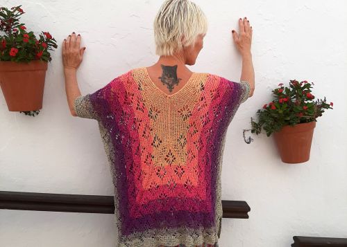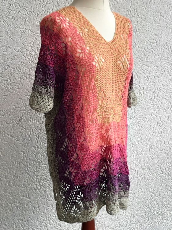 Der luftige Ponchollover "Flower Power" ist durch seinen weiten Schnitt sehr leicht an alle Größen anzupassen und ein wahres Häkelvergnügen. Ich trage ihn gerne im Lagenlook über Shirt´s und Kleider. Er kann auch ohne Ärmel als Shirt gehäkelt werden. Vorder- und Rückenteil werden vom Halsausschnitt an, immer in Runden gehäkelt. Die Ärmel werden zum Schluss direkt angehäkelt. (Für häkeln mit Farbverlaufsgarn: Es werden KEINE extra Armbobbel benötigt. Sie werden aus dem letzten Farbverlauf gehäkelt.) Seitlich hat der Ponchollover kleine Schlitze. Das Muster ist ein einfaches, aber sehr effektvolles Muster mit einer tollen Wirkung. Wir häkeln Stäbchen, Luftmaschen und feste Maschen. Alles erkläre ich in Fotostrecken, Textanleitung sowie eine, am PC erstellte Häkelschrift für Vorder- und Rückenteil ab Halsausschnitt. Es ist NICHT nötig die Häkelschrift lesen zu können, da ich Schritt für Schritt, mit Foto´s und Text, erkläre wie gehäkelt wird. Bei Fragen stehe ich zeitnah zur Verfügung. Der Anleitung wurde noch mal die Ursache für Fehlerquellen beim Start hinzugefügt!