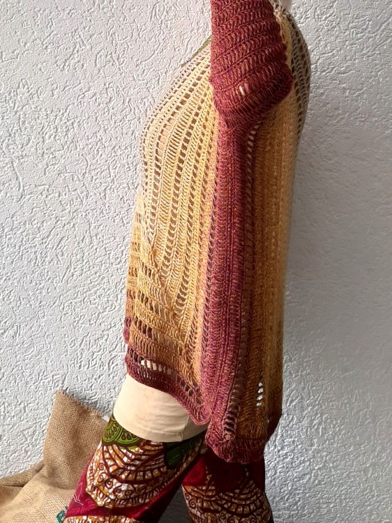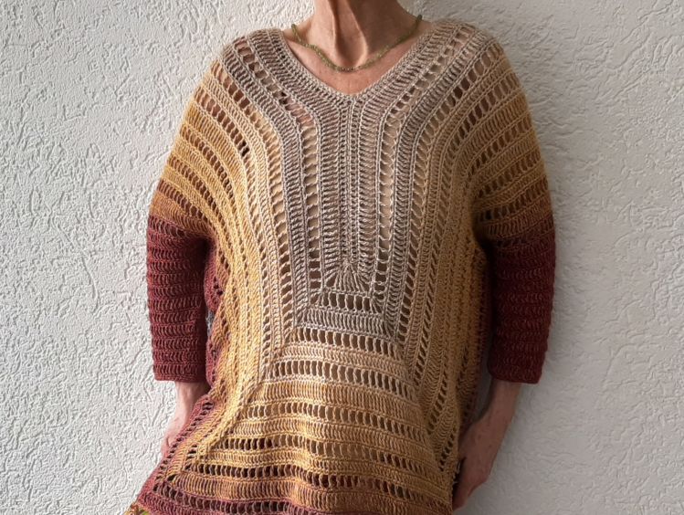 Meinen Ponchollover "Träumchen" habe ich sehr weit gehäkelt (Brustumfang ca.132cm, Länge ca. 68cm)). Er kann auch enger gemacht werden, aber auch weiter. Durch die einfache Form geht das sehr unkompliziert, wird aber auch in der Anleitung beschrieben.