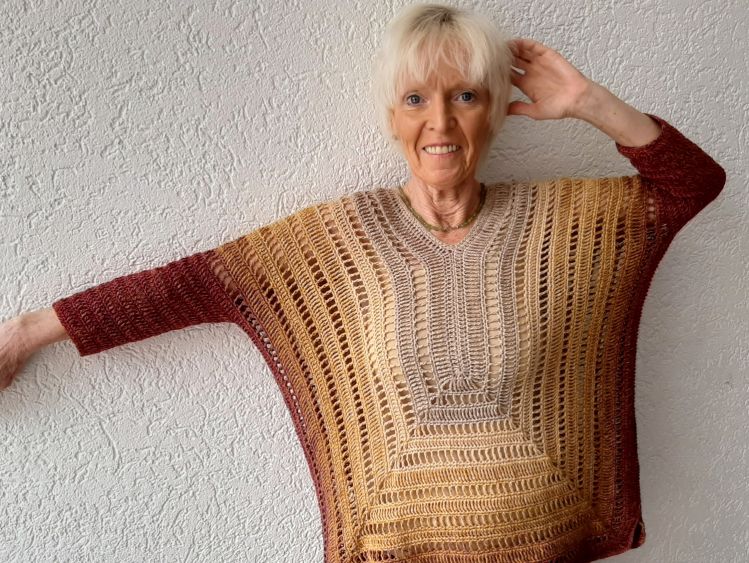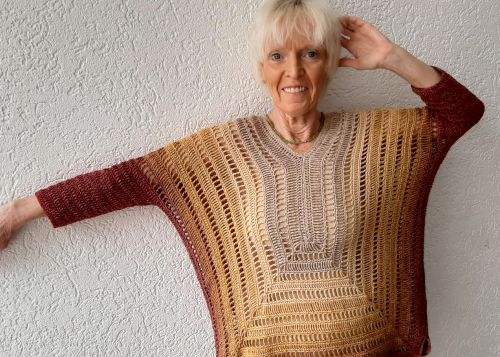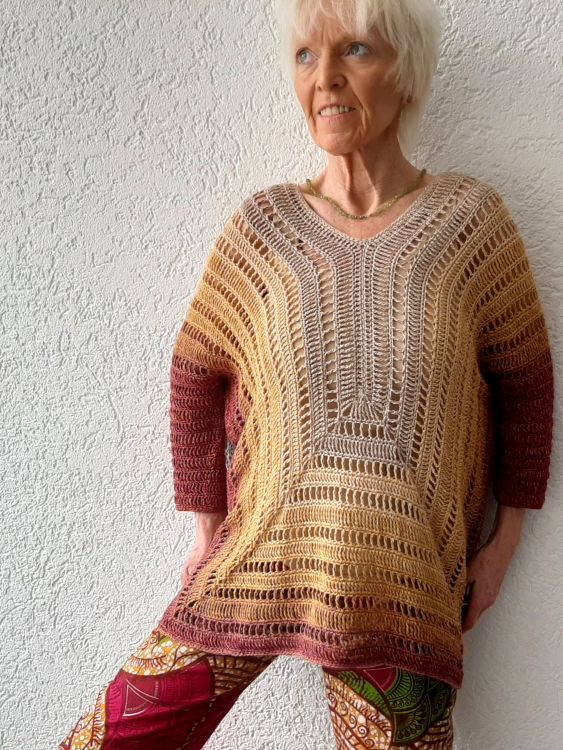 Der luftige Ponchollover "Träumchen" ist durch seinen weiten Schnitt sehr leicht an alle Größen anzupassen und ein wahres Häkelvergnügen. Er kann auch ohne Ärmel als Shirt gehäkelt werden. Vorder- und Rückenteil werden vom Halsausschnitt an, immer in Runden gehäkelt. Die Ärmel werden zum Schluss direkt angehäkelt. (Für häkeln mit Farbverlaufsgarn: Es werden keine extra Armbobbel benötigt. Sie werden aus dem letzten Farbverlauf gehäkelt.) Seitlich hat der Ponchollover kleine Schlitze. Das Muster ist ein einfaches, aber sehr effektvolles Muster mit einer tollen Wirkung. Wir häkeln Stäbchen, Doppelstäbchen, Dreifachstäbchen und feste Maschen. Alles erkläre ich in Fotostrecken, Textanleitung sowie eine, am PC erstellte Häkelschrift für Vorder- und Rückenteil ab Halsausschnitt, sowie Ärmel. Es ist NICHT nötig die Häkelschrift lesen zu können, da ich Schritt für Schritt, mit Foto´s und Text erkläre wie gehäkelt wird. Bei Fragen stehe ich zeitnah zur Verfügung.