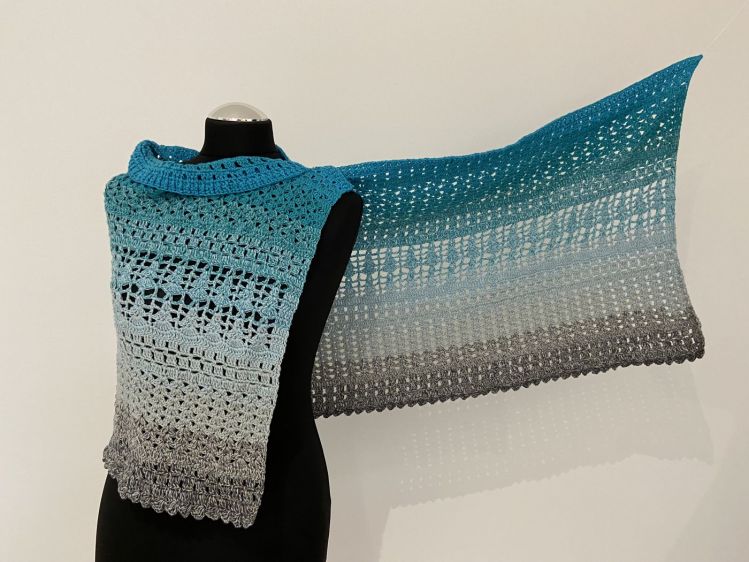 Der Begriff „Skärpa“ kommt aus dem schwedischen und bedeutet "Spitzen“... und die sind an der Stola „Skärpa“ am unteren Rand zu finden. Da bei dieser Stola keine Zu- und Abnahmen gearbeitet werden, ist sie auch für Anfänger geeignet. Unter Verwendung des angegebenen Materials wird die Stola ca. 45 cm hoch und ca. 140 cm lang. Die Anleitung enthält die Häkelschrift und eine schriftliche Beschreibung für die einzelnen Muster. Für das Nacharbeiten wird folgendes Material benötigt: 1000 m Farbverlaufsgarn Häkelnadel Nr. 3 Schere Nadel zum Vernähen der Fäden