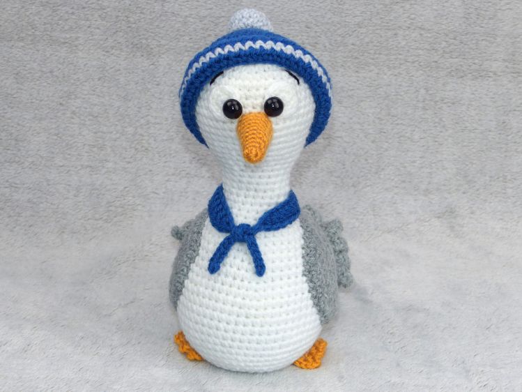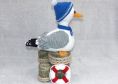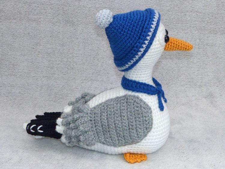 Je nach Garn- und Häkelnadelstärke variiert die Größe von der Möwe plus Deko.