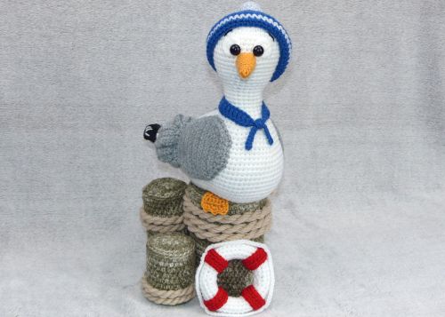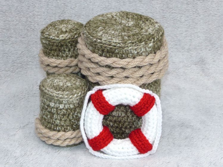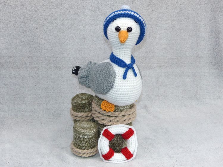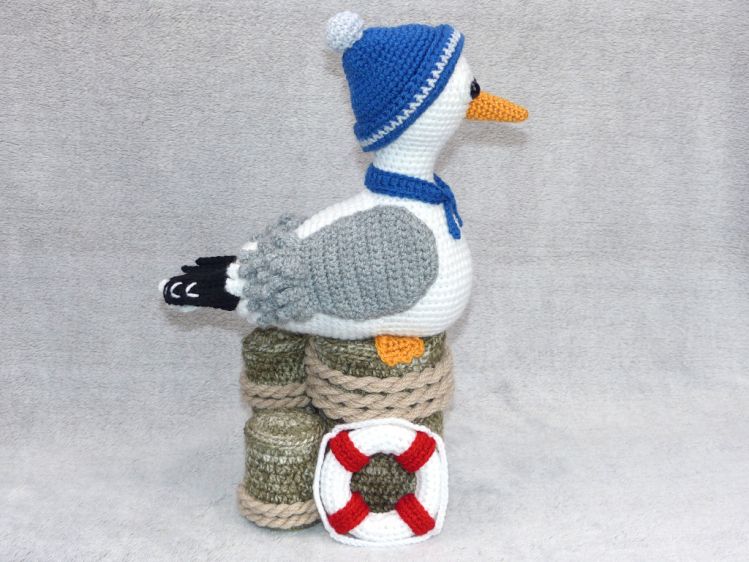 Ich beschreibe euch in der Anleitung wie die Möwe, die Holzpoller und der Rettungsring gehäkelt wird.