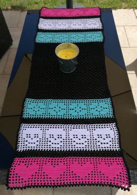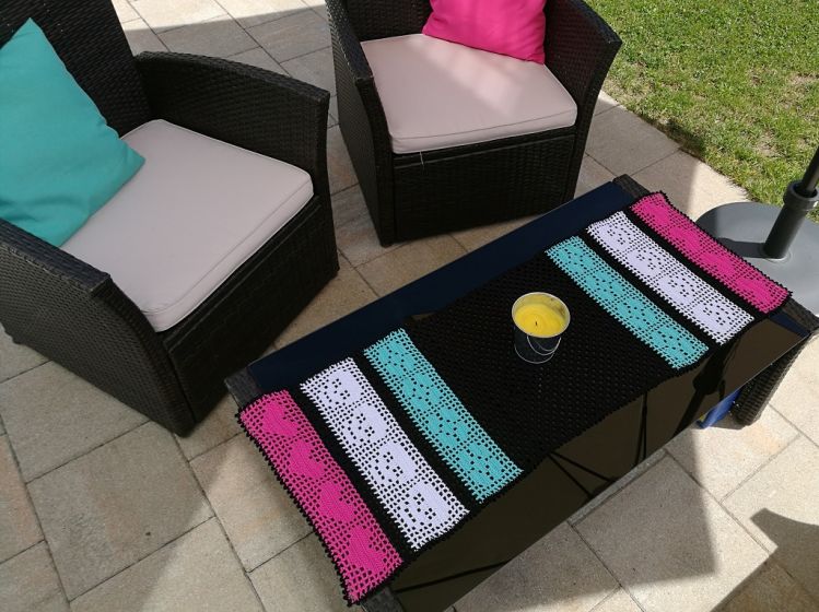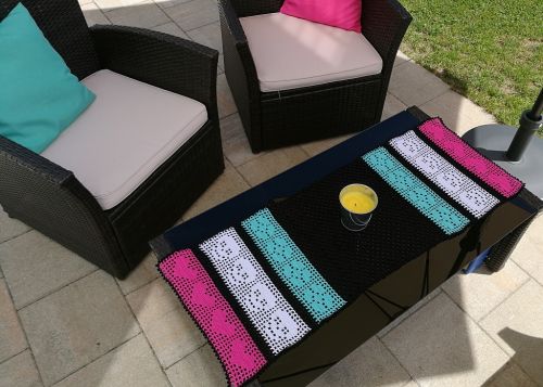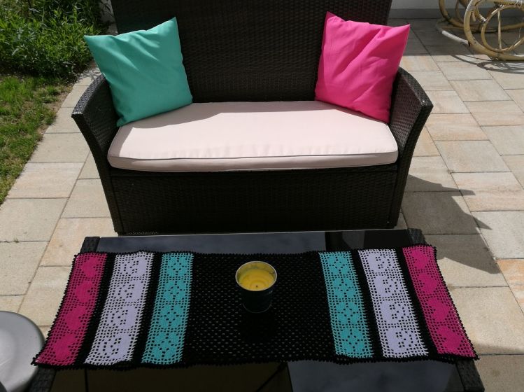 Schon so lange habe ich an einem Tischläufer getüftelt, der mir gefällt und zu unserer Terrassen-Garnitur passt! Ich habe es geschafft, endlich.