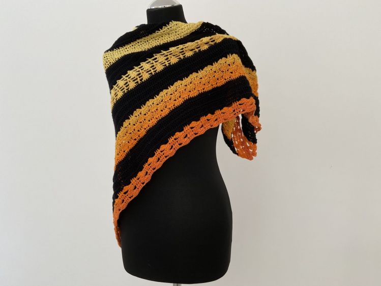 Wie auf den Fotos meiner Probehäklerinnen ersichtlich, ist das Tuch auch in zwei Unifarben ein Hingucker.
