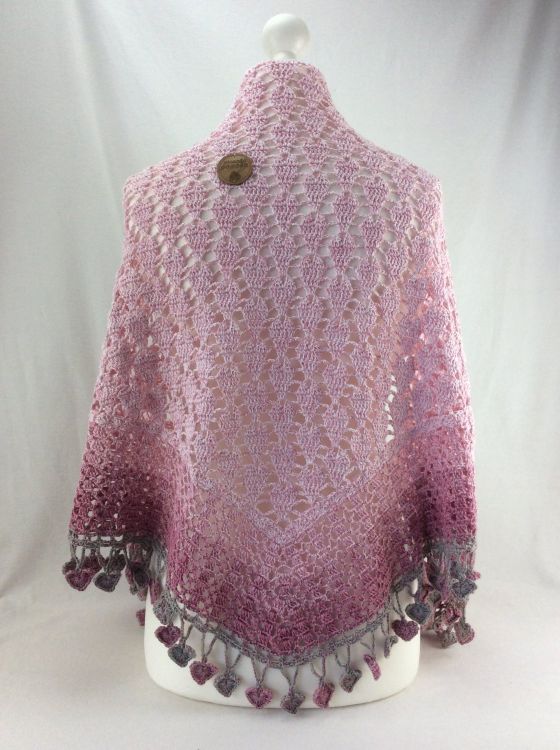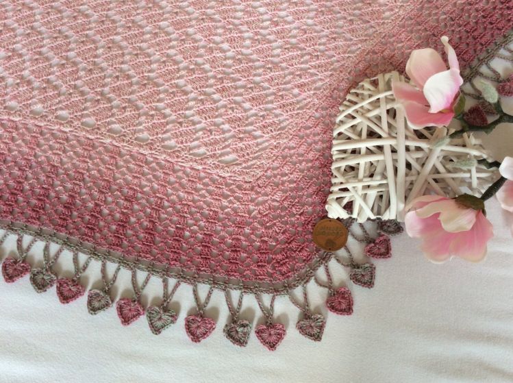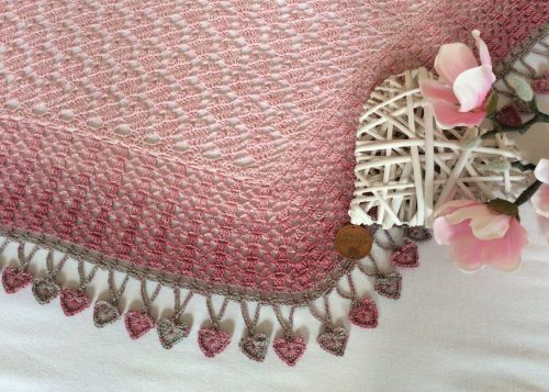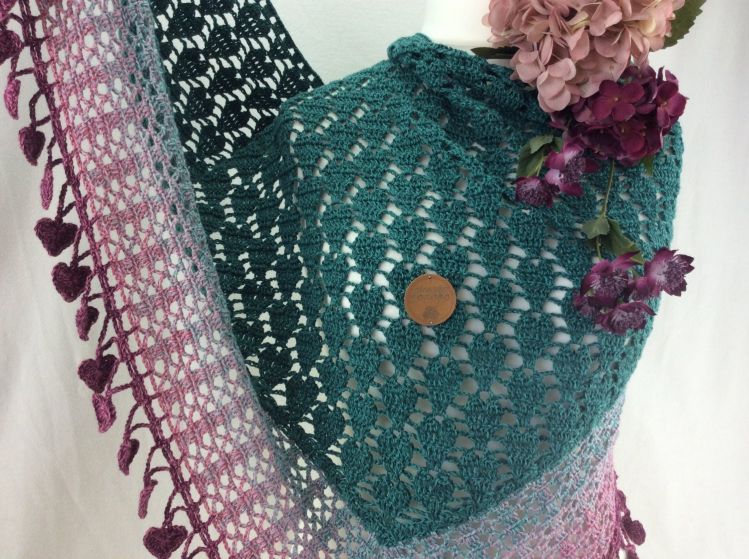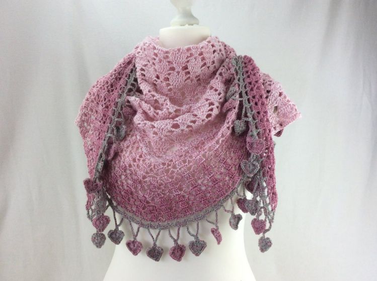 Das Tuch hat bei mir ca. eine Spannweite von 212 cm und eine Länge von 70 cm (ohne die Herzen am Rand).