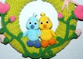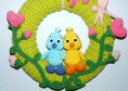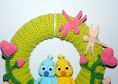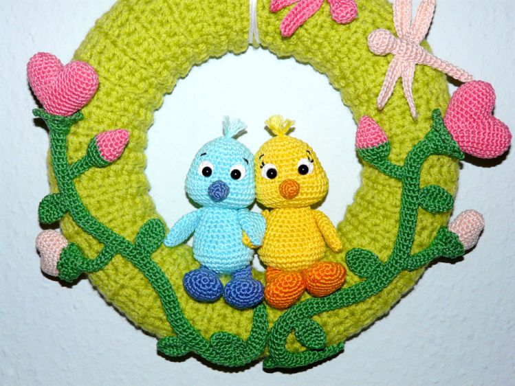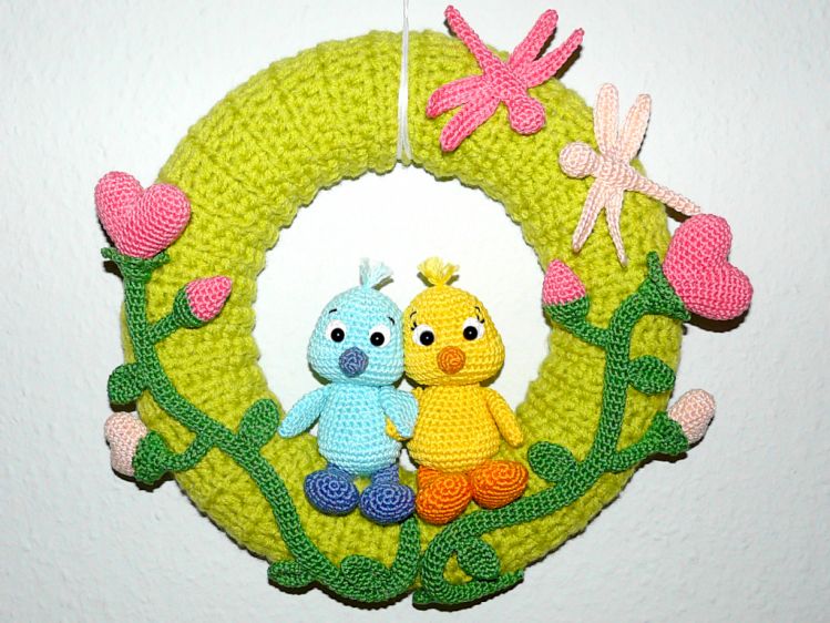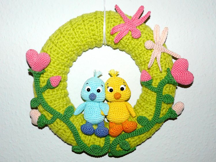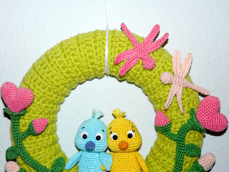 Je nach Garn- und Häkelnadelstärke variiert die Größe von dem Türkranz, den Küken, Libellen und Herzranken.