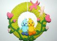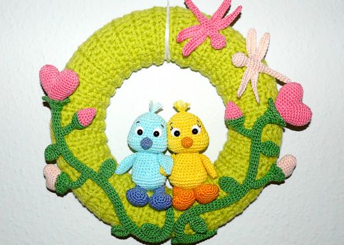 Meine beiden Küken sind schon völlig in Frühlingsstimmung. Sie haben es sich auf dem saftig grünen Kranz bequem gemacht und kuscheln miteinander. Umrahmt werden die beiden Turteltäubchen von hübschen Herzranken und Libellen.