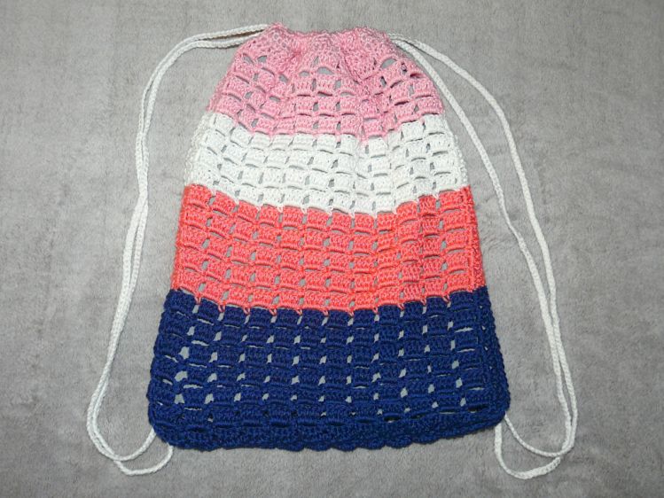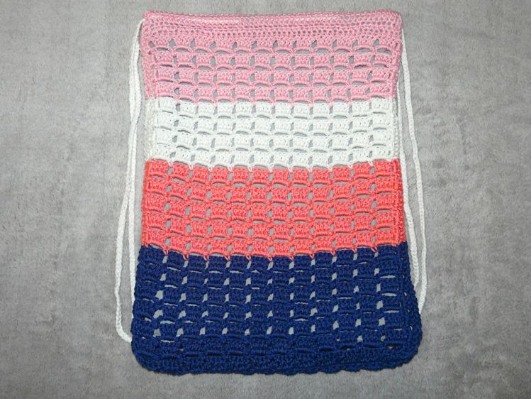 Taschen oder Beutel kann man doch nie genug haben :D Dieser schicke Turnbeutel bietet Platz für viele Sachen. Ob beim Spaziergang oder beim Einkaufen, in diesem Turnbeutel könnt ihr all eure Kleinigkeiten verstauen, die ihr gerne bei euch habt. Da das Muster recht grobmaschig ist, hat der Turnbeutel ein Futter, damit nichts verloren geht. Die Kordeln sind aus Baumwolle geflochten.