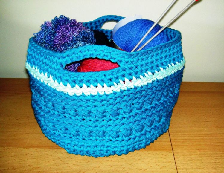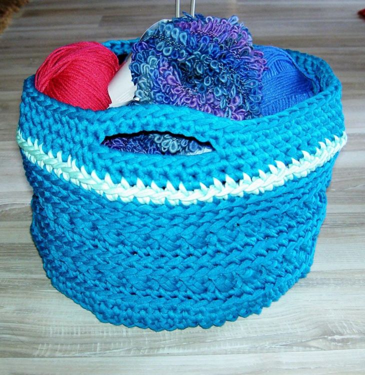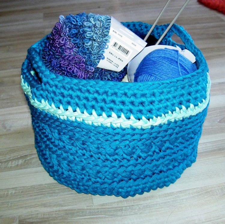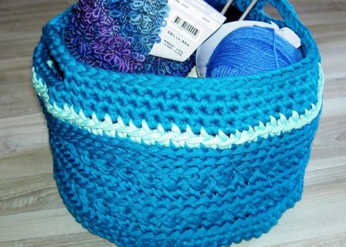 Dieser praktische Wollekorb / Utensilo wurde aus 600 g Textilgarn gehäkelt.