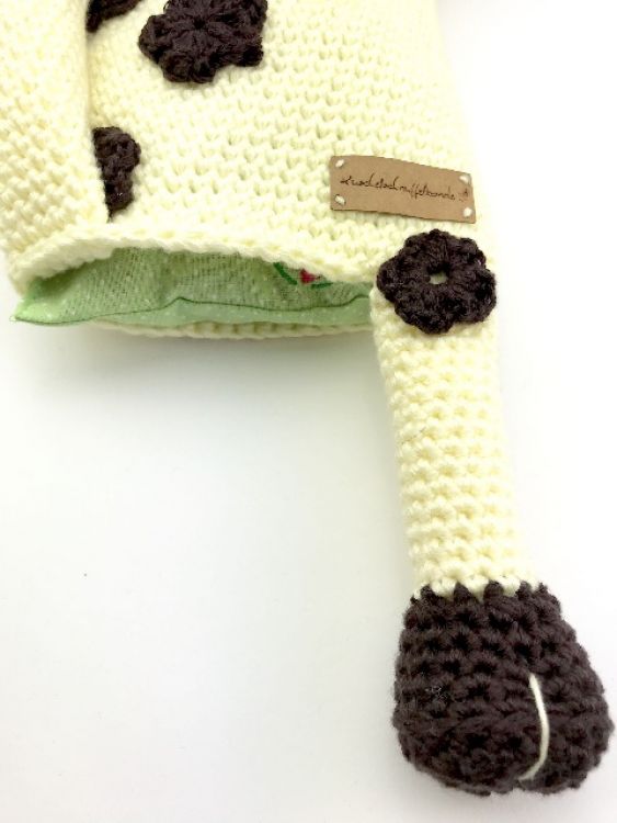 Mit dem angegebenen Garn (es wird mit doppeltem Faden gehäkelt) und der Nadelstärke 6mm wird der Wärmekissenbezug Giraffe „Gisela“ insgesamt ca.48cm groß. Geeignete Wärmekissengröße von ca.14cmx21cm.