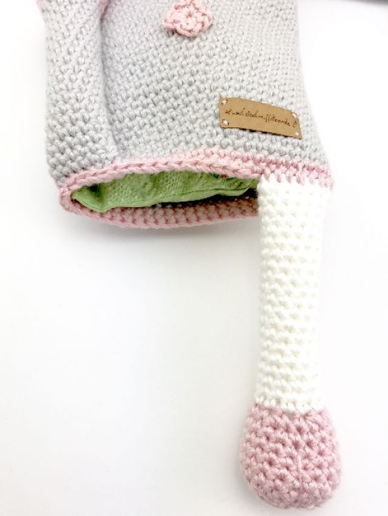 Mit dem angegebenen Garn (es wird mit doppeltem Faden gehäkelt) und der Nadelstärke 6mm wird der Wärmekissenbezug Kuschelschnuffelbande Schaf „Wölkchen“ insgesamt ca.46cm groß. Geeignete Wärmekissengröße von ca.14cmx21cm.