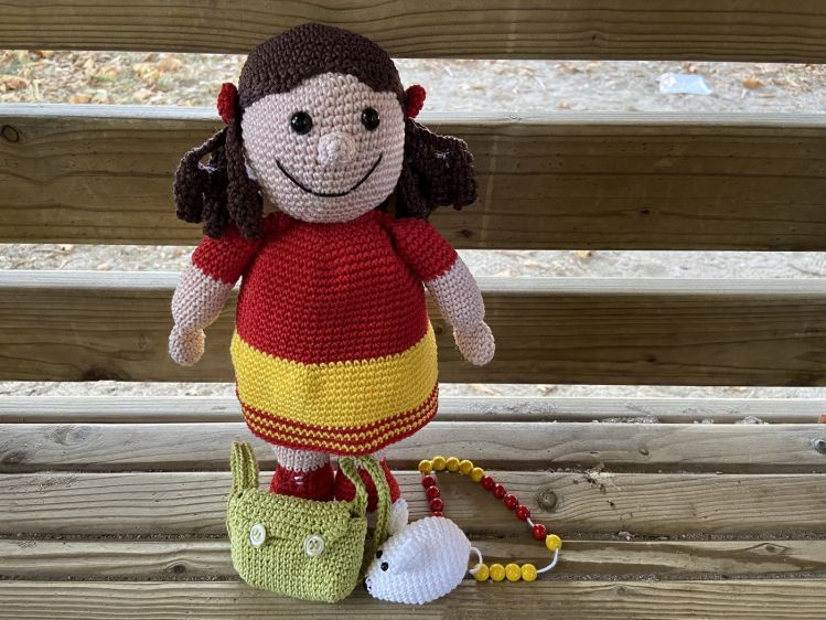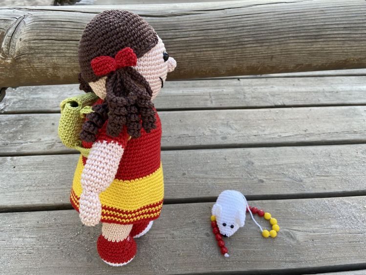 Für das Nacharbeiten wird folgendes Material benötigt: 100 g Baumwollgarn in hautfarbe, 50 g Baumwollgarn in rot, 25 g Baumwollgarn in gelb, 25 g Baumwollgarn in dunkelbraun, Rest Baumwollgarn in hellgrün (Schulranzen), weiß (Maus) und schwarz (Konturen), 1 Paar Sicherheitsaugen, 9 mm (Zilly Zahl), 1 Paar Sicherheitsaugen, 5 mm (Rechenmaus), 20 Holzperlen, 10 mm, zwei Farben à 10 Stück, 2 Knöpfe, 10 mm (Schulranzen), Füllwatte,