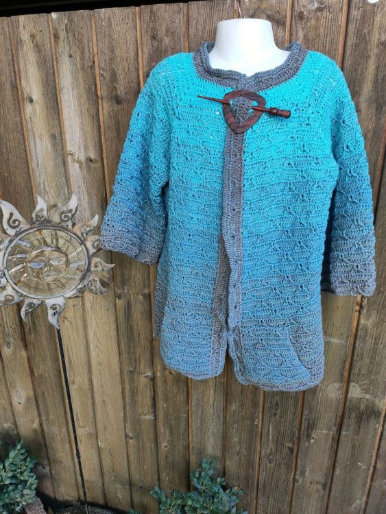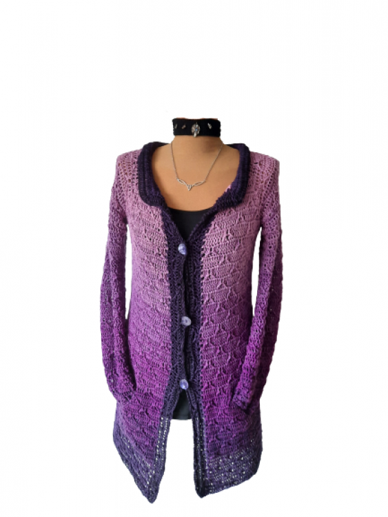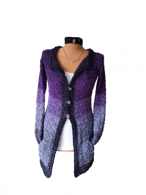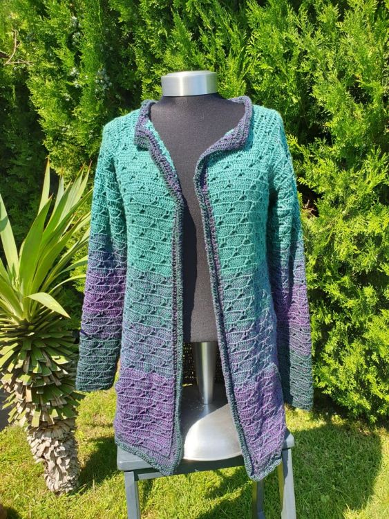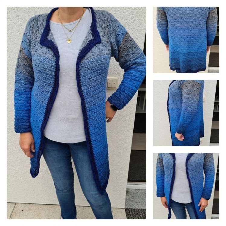 Gr. 36 ca. 1640m, 4fädig, NS 3,0 Verbrauch: Korpus ca. 1000m, Taschen je ca. 120m, Ärmel je ca. 200m, Umrandung ca. 200m