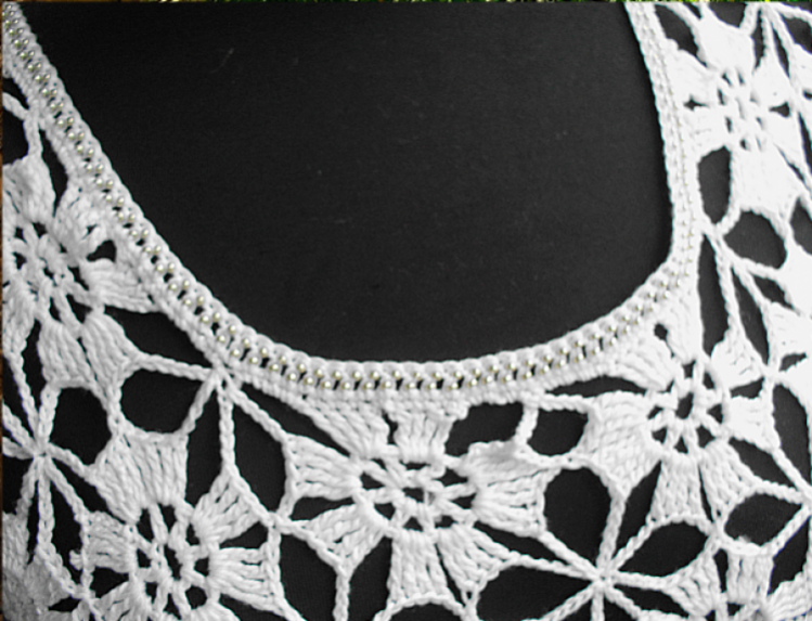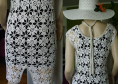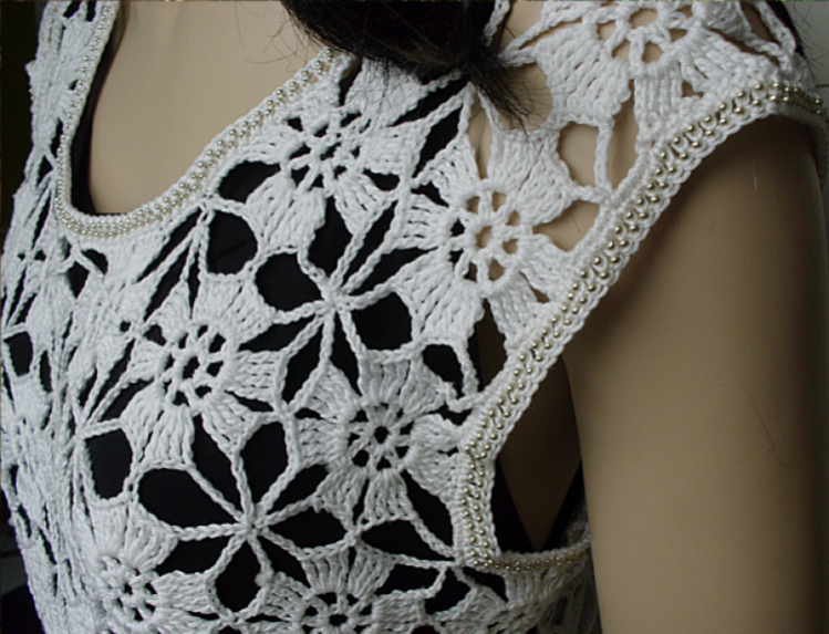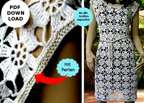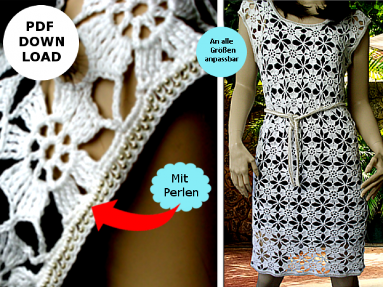 Dieses umwerfende Kleid wird aus vielen, vielen Quadraten zu einem Meisterwerk zusammengefügt und an Armen, Hals, Saum und Schlitz mit Perlen verziert. Ausdauer und Geduld sind gefragt, aber der Aufwand lohnt sich, denn das Ergebnis ist einfach traumhaft schön.