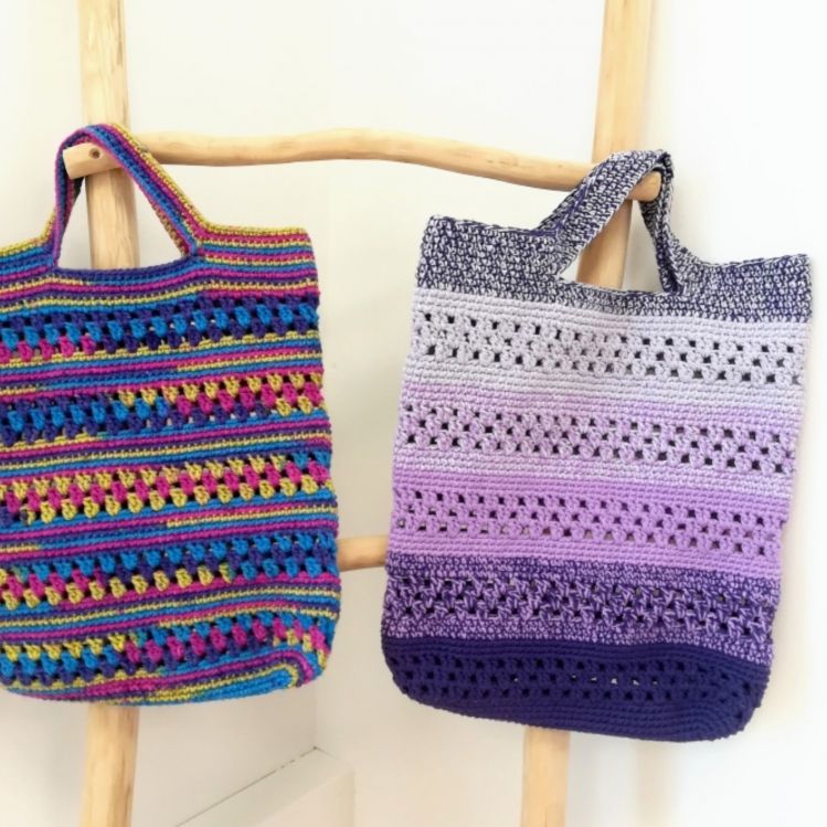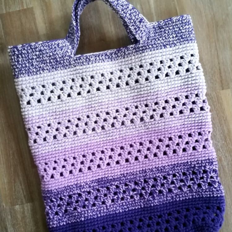 Die Paula in den Lila-Tönen hat ein Endgewicht von 480g, Baumwollgarn doppelt gehäkelt.