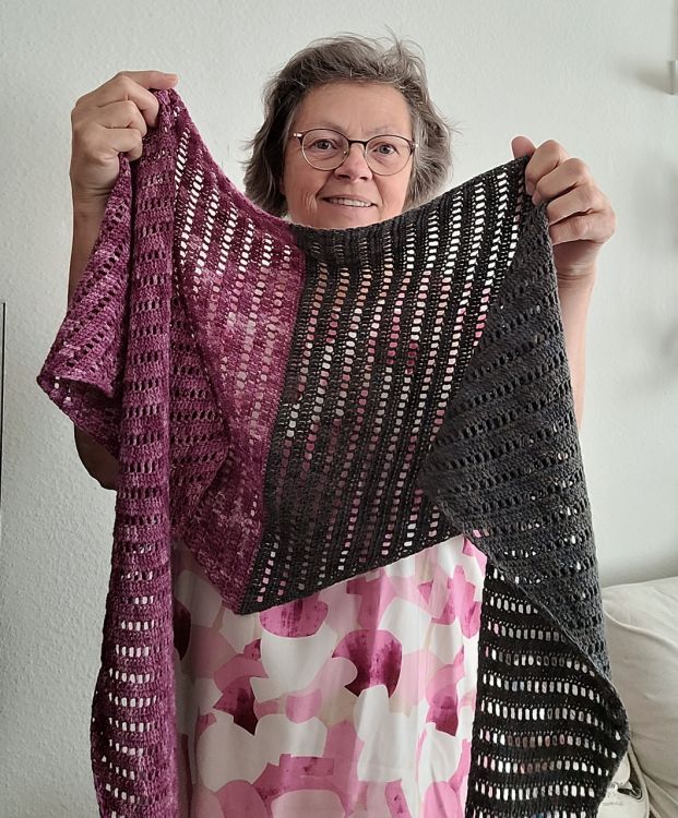 Das Häkeltuch Sina ist ideal für Anfänger beim Häkeln. Ein einfaches Muster aus Stäbchen und Luftmaschen und ebenso eine einfache Konstruktion, die auch anpassbar ist an andere Größen. Gehäkelt aus 2 verschiedenfarbigen Strängen eines Merino- Seiden- Garns. Die Anleitung ist ohne Abkürzungen geschrieben und mit vielen Bildern unterstützt. Viel Freude beim Nacharbeiten.