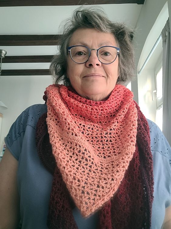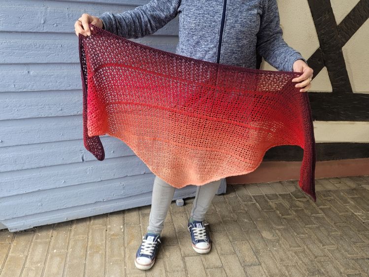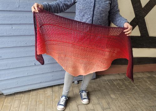 Wie immer ohne Abkürzungen, dafür mit vielen Detailbildern und mit einer ausführlichen Beschreibung der eingefügten Stäbchen- Reihen. Auch das Beenden der Tücher ist einzeln aufgeführt.